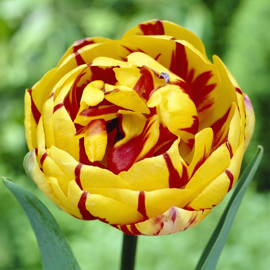 Воплощение грациозности и изящества. Красные язычки пламени на фоне золотисто-желтых махровых лепестков. Тюльпан порадует Вас своим ярким цветением в конце сезона.