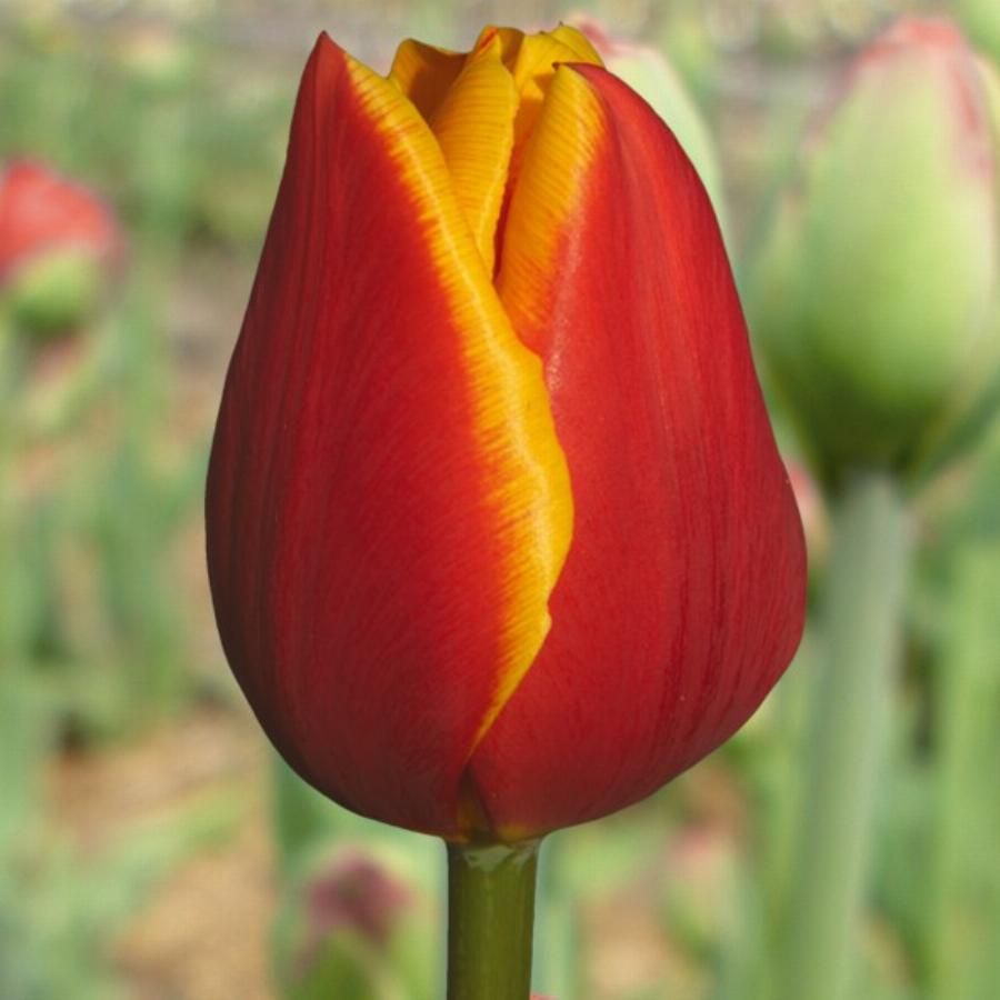 Класс 3. Триумф тюльпаны. Цветок яркий, кроваво-красный с очень выразительной широкой золотистой каймой, овально-бокаловидный, крупный. Отличная зимняя выгонка и великолепная срезка.