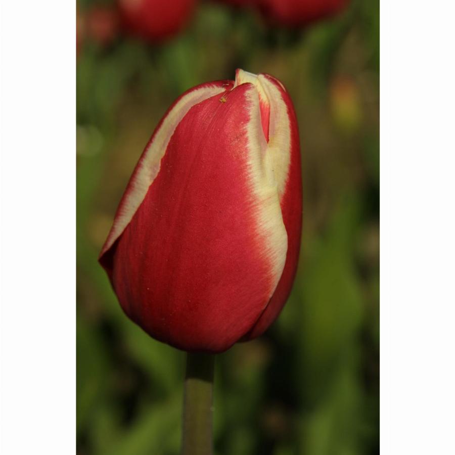 Высокий до 55 см. тюльпан. Цветок красный с фиолетовым оттенком и кремово-желтой, почти белой каймой. Цветонос крупный, стройный и прочный. Пригоден для выгонки с января.