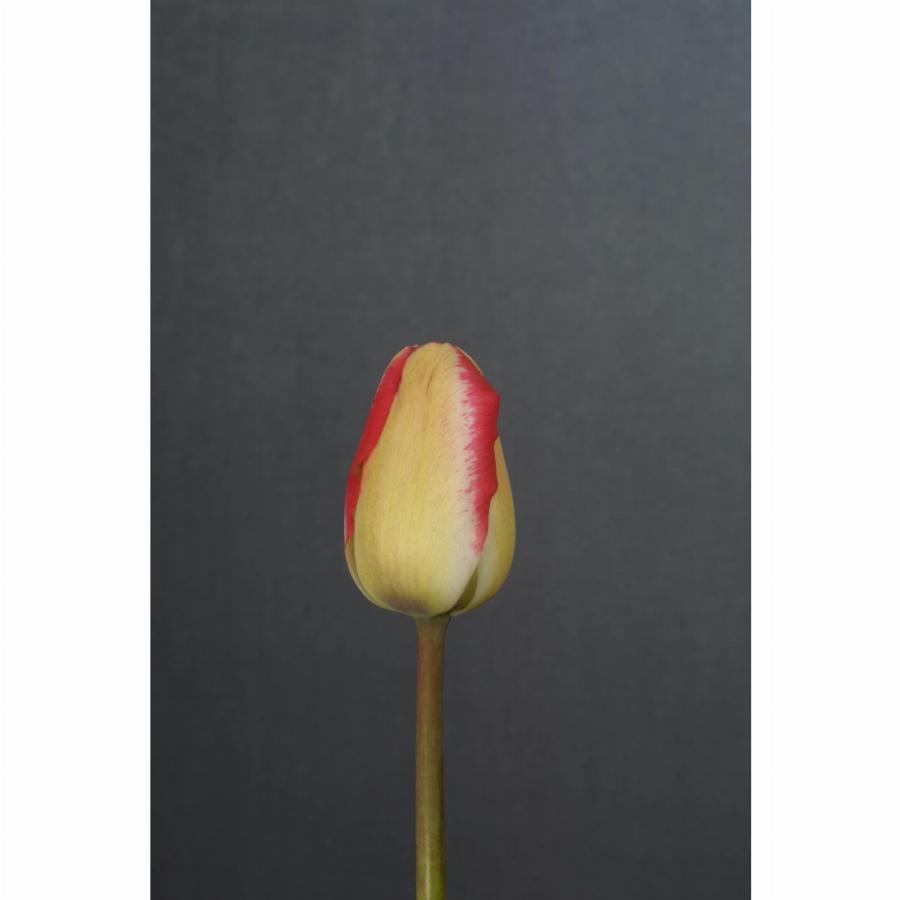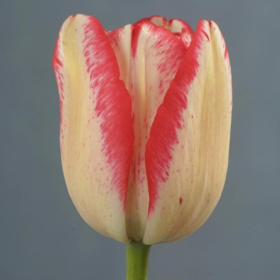 Класс 5. Простые поздние. Цветок кремово-белый с яркими красными краями лепестков, красивой бокаловидной формы, крупный. Цветонос стройный и прочный.
