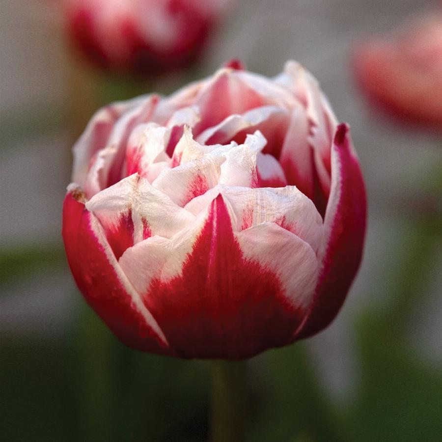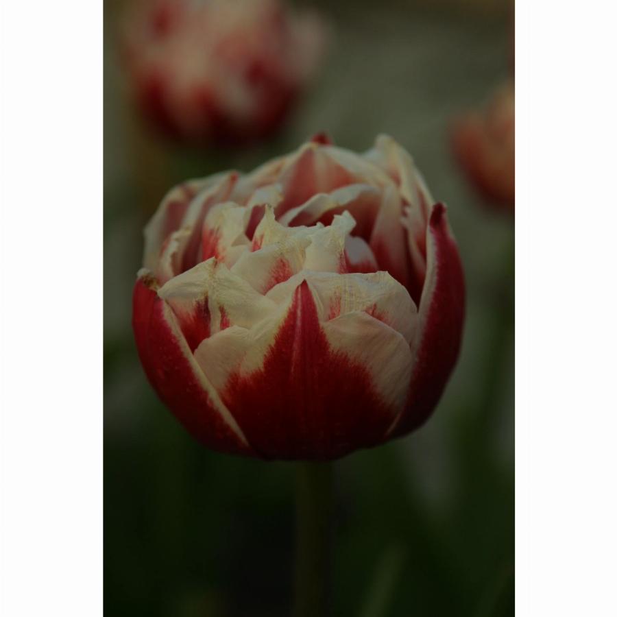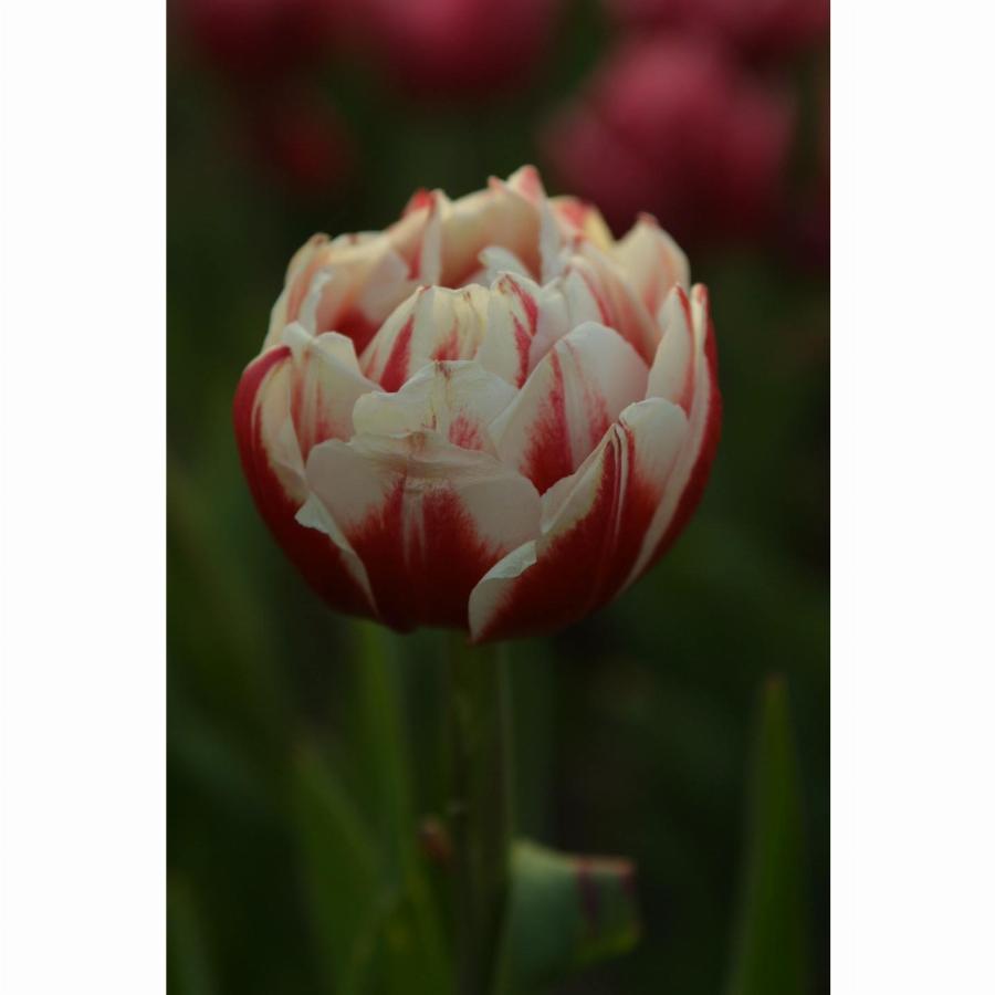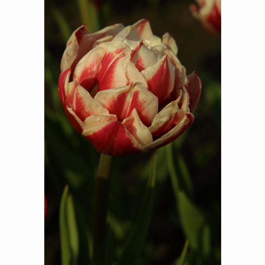 Класс 2. Махровые ранние тюльпаны. Цветок пионовидной формы с многочисленными розово-красными с белой каймой лепестками. Цветение приходтся на начало-середину мая. Высота растения 30-50 см. Прекрасный сорт для срезки, украшение сада и зимней выгонки.