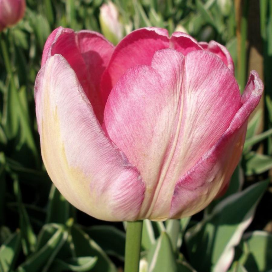 Класс 3. Триумф тюльпаны. Окраска цветка светло-желтая с переходом в яблонево-розовую, края лепестков фуксиново-красные. Растения с эффектными листьями-беловатая штриховая полоса по краю. Экзотика.