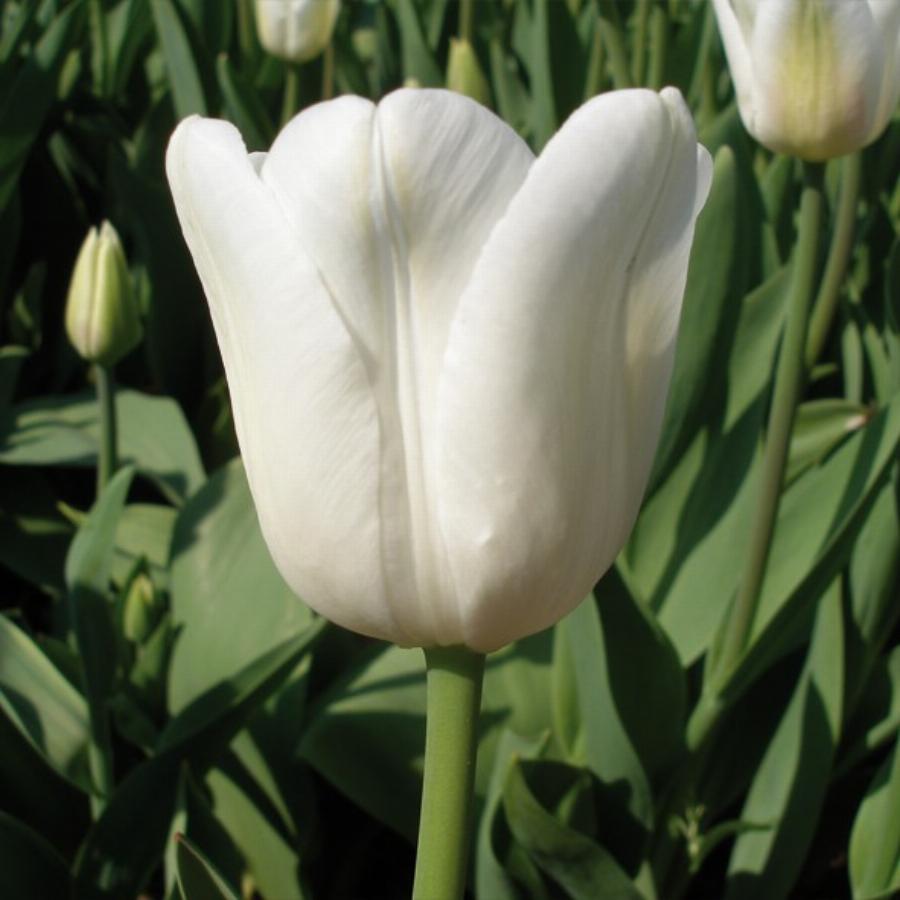 Белоснежный тюльпан бокаловидной формы до 7см и диаметром до 5 см. Высота растения достигает 50 см на крепком цветоносе. Сроки цветения средние, продолжительные Размножается хорошо. Используется для озеленения и выгонки с Нового года.
