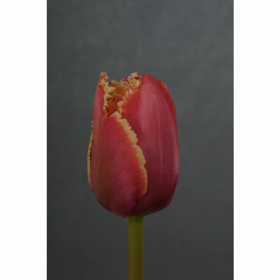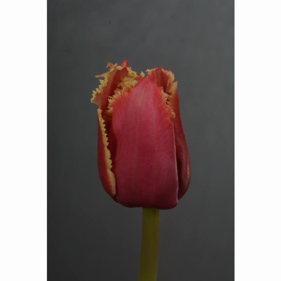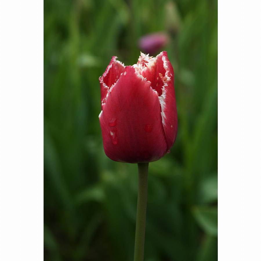 Кардинально красный с блестящей поверхностью и густой чисто белой бахромой подчеркивающей выточеную форму бокала