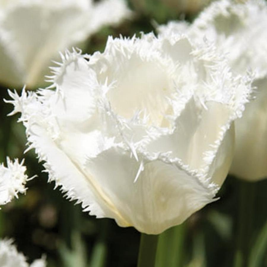 Высотой до 55 см. тюльпан. Цветок белый чашевидной формы по краям лепестков игольчатая бахрома.