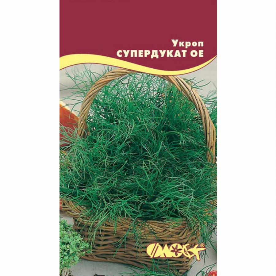 Укроп Супердукат ОЕ — традиционный позднеспелый сорт, период от всходов до уборки урожая 50-55 дней. Растение хорошо облиственное. Листья среднего размера, зеленые с восковым налетом, сочные, нежные. Ароматичность высокая. Сорт отличается замедленным стеблеванием и длительным периодом товарной годности. Рекомендован для выращивания на зелень и специи. Используется в свежем виде и для переработки.