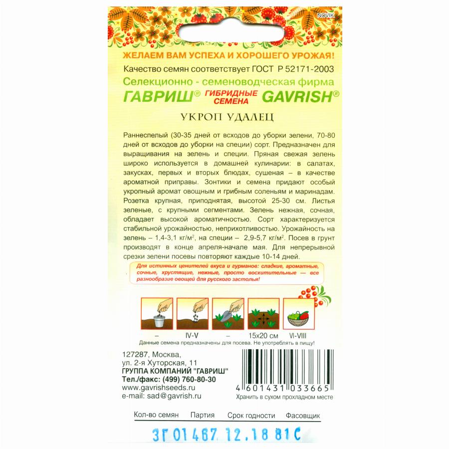 Раннеспелый (30-35 дней от всходов до уборки зелени, 70-80 дней от всходов до уборки на специи) сорт. Предназначен для выращивания на зелень и специи. Пряная свежая зелень широко используется в домашней кулинарии: в салатах, закусках, первых и вторых блюдах, сушеная — в качестве ароматной приправы. Зонтики и семена придают особый укропный аромат овощным и грибным соленьям и маринадам. Розетка крупная, приподнятая, высотой 25-30 см. Листья зеленые с крупными сегментами. Зелень нежная, сочная, обладает высокой ароматичностью. Сорт характеризуется стабильной урожайностью, неприхотливостью. Урожайность на зелень 1,4-3,1 кг/м2, на специи 2,9-5,7 кг/м2.Посев в грунт производится в конце апреля – начале мая. Для непрерывной срезки зелени посевы повторяют каждые 10-14 дней.