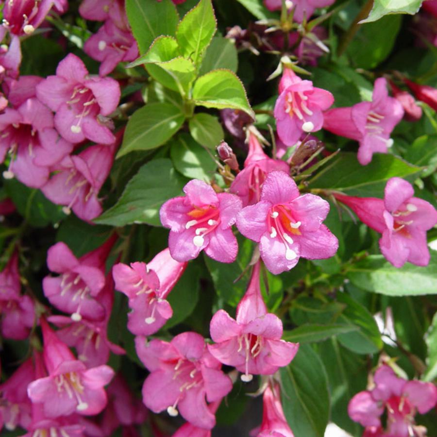 Вейгела цветущая Боскоп Глори — кустарник высотой 150 см, со светло-зелеными листьями и яркими розово-красными цветками, которые начинают распускаться в июне.