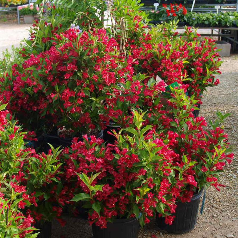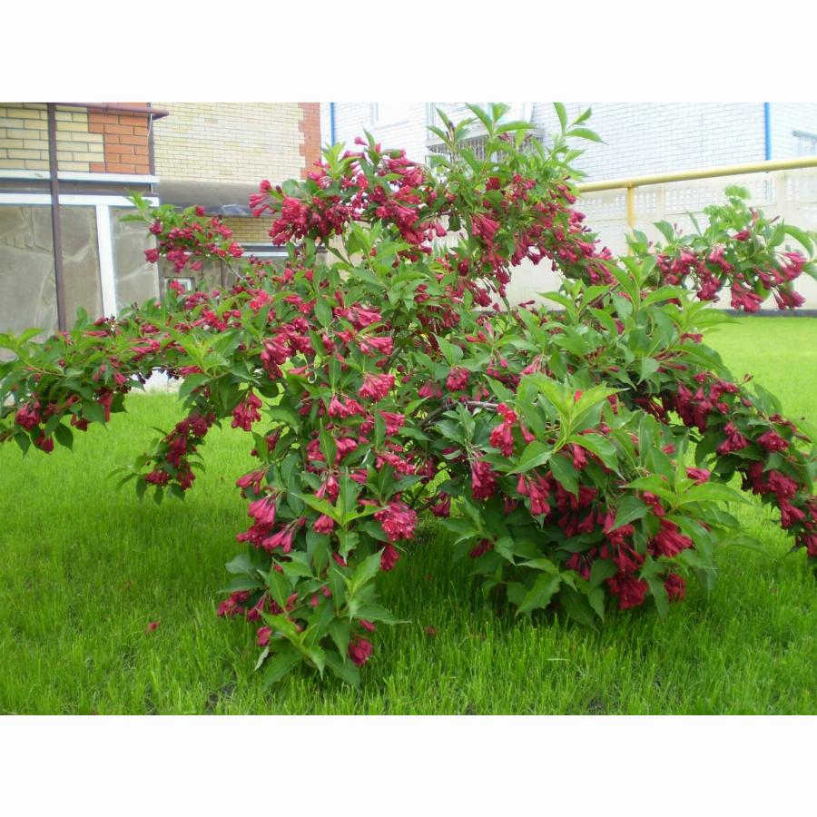 Н=1 м с широкой кроной и поникающими ветвями. Цветки ярко-красные, не выгорающие на солнце, собраны в соцветия. Цветение с мая, повторноцветущий.