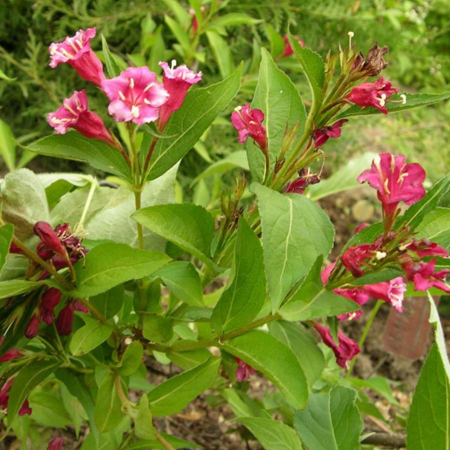 Красивоцветущий кустарник с округлой кроной. Высота 1-1,2 м, ширина 1,2 м. Листья эллиптические, светло-зеленые, с бронзово-пурпурным оттенком. Цветет в мае-июне, колокольчатыми красно-рубиновыми снаружи, и лилово-розовыми внутри цветками в соцветиях. Склонна к повторному, но менее обильному цветению в августе-сентябре.
