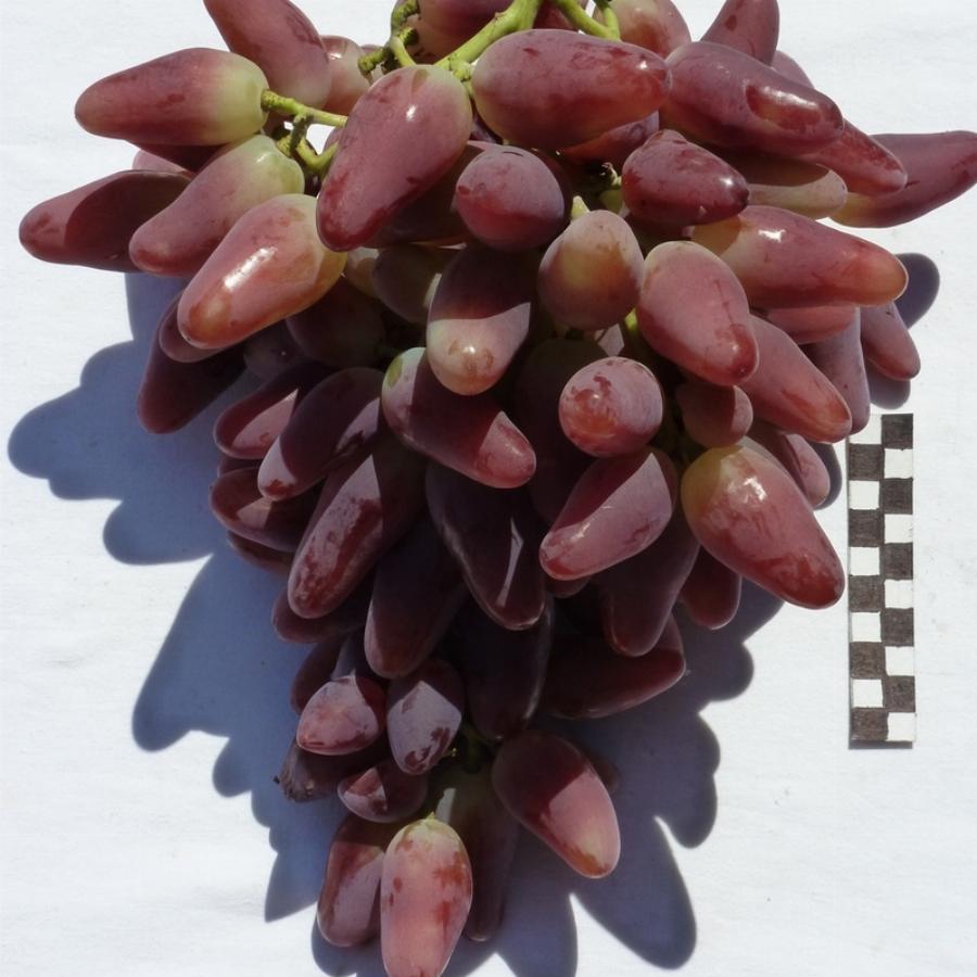 Раннего срока созревания. Отличается большой силой роста в корнесобственных насаждениях, с очень крупными гроздями и ягодами. Грозди не плотные, конические, иногда с крылом, средней массой 1200-1500гр. Ягоды очень крупные, оригинального внешнего вида, с заостренным и слегка изогнутым кончиком, 59-29мм, средней массой окло 20гр, темно розового цвета. Морозостойкость до -29°С.