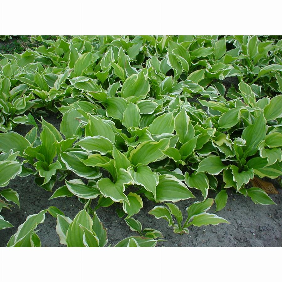 Веселая крупная хоста! Листья темно-зеленые с яркой кремово-желтой каймой. Высота 40-60 см. Обильно цветет.