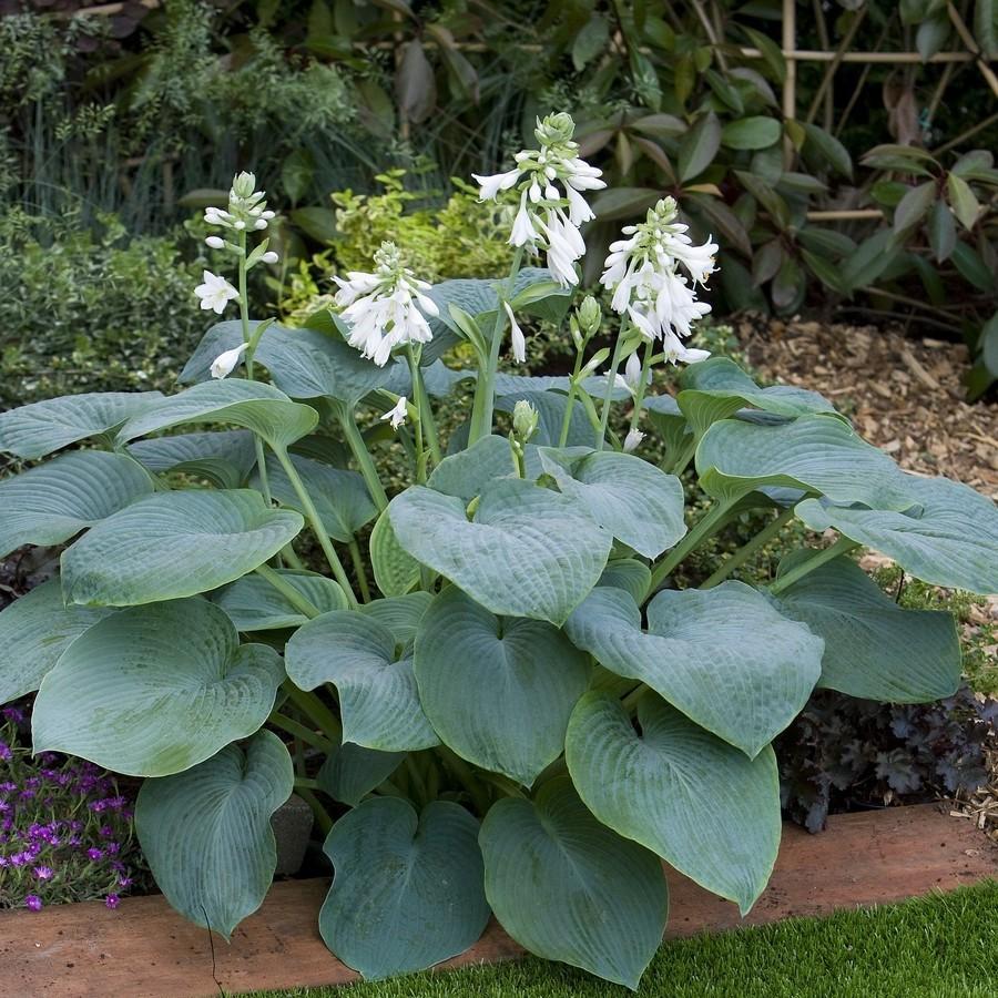 Высота 36, ширина 50см. Цветение июль. Листья овальные, крупные, голубовато-зеленые, цветы белые. Место: тень, полутень.