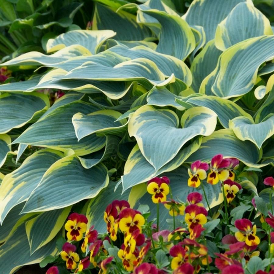В высоту она достигает 25-40 см, в диаметре — 70-80 см. Кустик компактный, пышно облиственный, фонтанообразный. Длина листа — 15-18 см, ширина — 12-13 см. Листовая пластина голубоватого цвета, по краям — золотисто-желтая (к осени основной фон становится темно-зеленым, а штриховатая кайма – кремовой). Цветочки появляются в начале или середине июля и отцветают в августе. Небольшие бледно-лавандовые колокольчики растут в соцветиях на высоких безлиственных цветоносах. Корневая система — мощная, разветвленная, поверхностная.