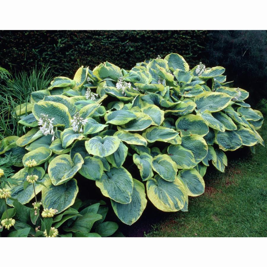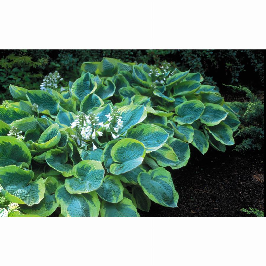 Роскошная большая хоста. Высота куста 0,5-0,7 м. Ширина 1,2 м. Имеет округлые сине-зеленые листья с широким кремовым краем. Листья у этой красавицы морщинистые, с возрастом достигают просто гигантских размеров. Листовая пластина 30 х 29 см.
