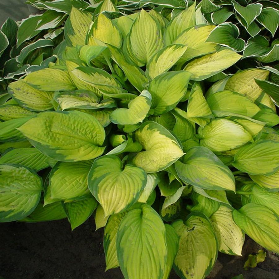 Очень интересная хоста — ярко-золотой центр листа, по краю широкая зеленая кайма! У молодых листьев весной центр листа салатовый, с середины июня становится золотой. Листья некрупные овальные. Размер листа 21х14 см. Высота растения до 55 см, ширина куртины до 1 м. Цветет сиреневыми цветками в июле. Любит полутень, на ярком солнце листья выгорают, в тени окраска тускнеет.