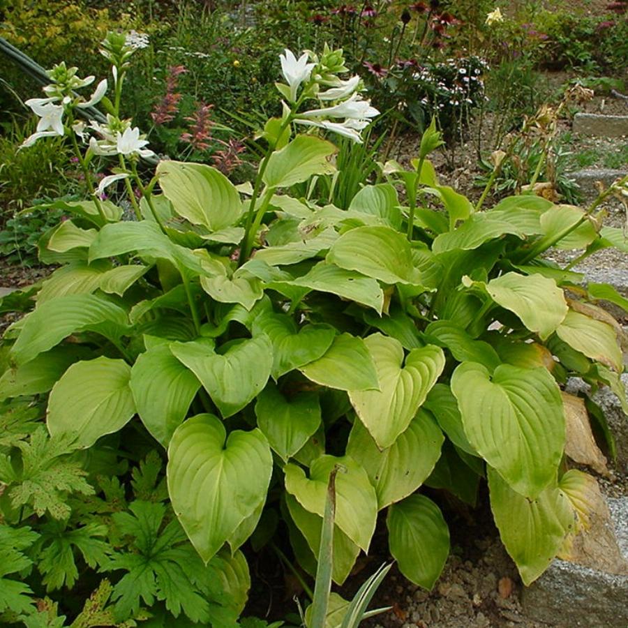 China, природная форма, L, листья крупные (17.5х15см.) широко-сердцевидные, блестящие, волнистые, желтовато-зелёные, жилки ярко выражены, цветы чисто белые с чудесным ароматом. Полутень-солнце.