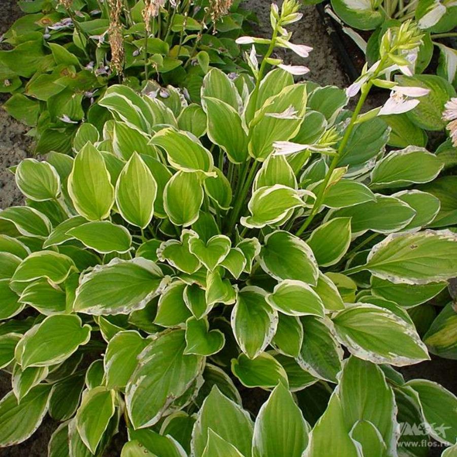 P.Aden 1986, M; листья овальные (18х11см.), блестящие, слегка жатые, средне зелёные с широкой кремово-белой каймой, черешки очень длинные, куст вазообразный, цветки белые, душистые. Тень-лёгкая тень. Хоста года 1996.