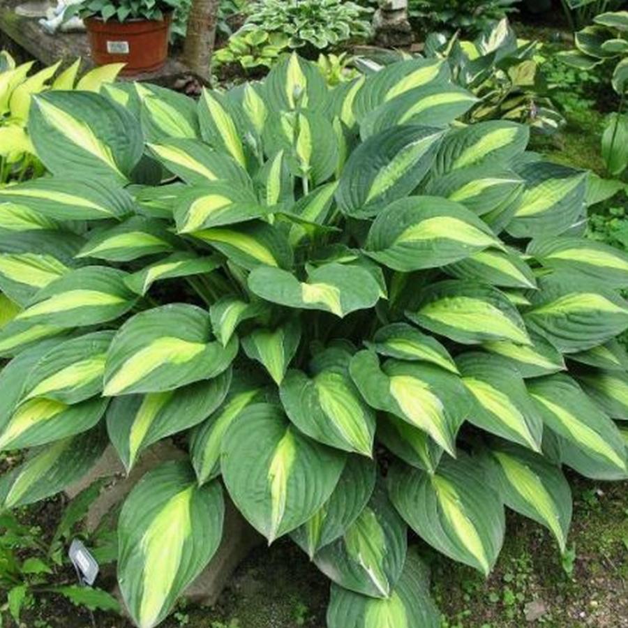 Высота: 50-75 см. Ширина: 60-90 см Листья овально-сердцевидные с острой верхушкой,20 х 15 см. Окраска необычная: узкий зеленовато-жёлтый центр листа отделен от широких тёмно-зелёных краев ярко-белыми узкими полосками. Цветки воронкообразные, лиловые. Зацветает в июле.