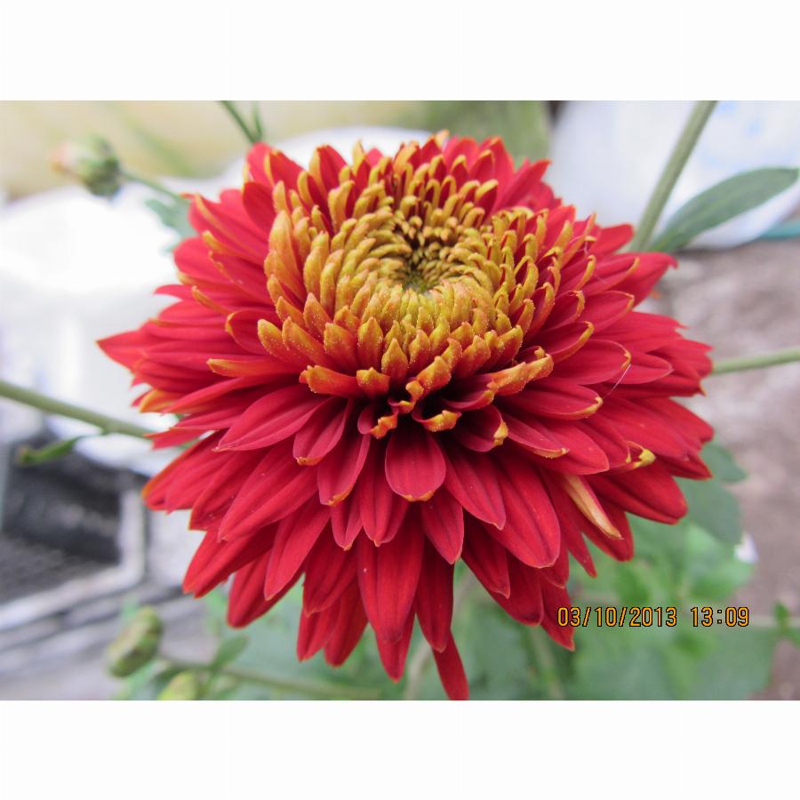 Куст 50-70 см высотой, диаметр цветка 7 см., колонновидной формы. Побеги мощные, немногочисленные. Соцветия махровые, верхняя сторона язычковых цветков красная, нижняя жёлтая. Цветёт в сентябре.