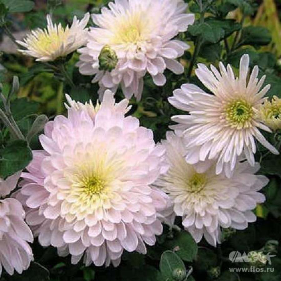 Высота куста 0,6 м. Цветок розовато-лососевый с желтым центром, махровый диаметром 6 см. Зацветает в сентябре. Зимостойка (-28,5).