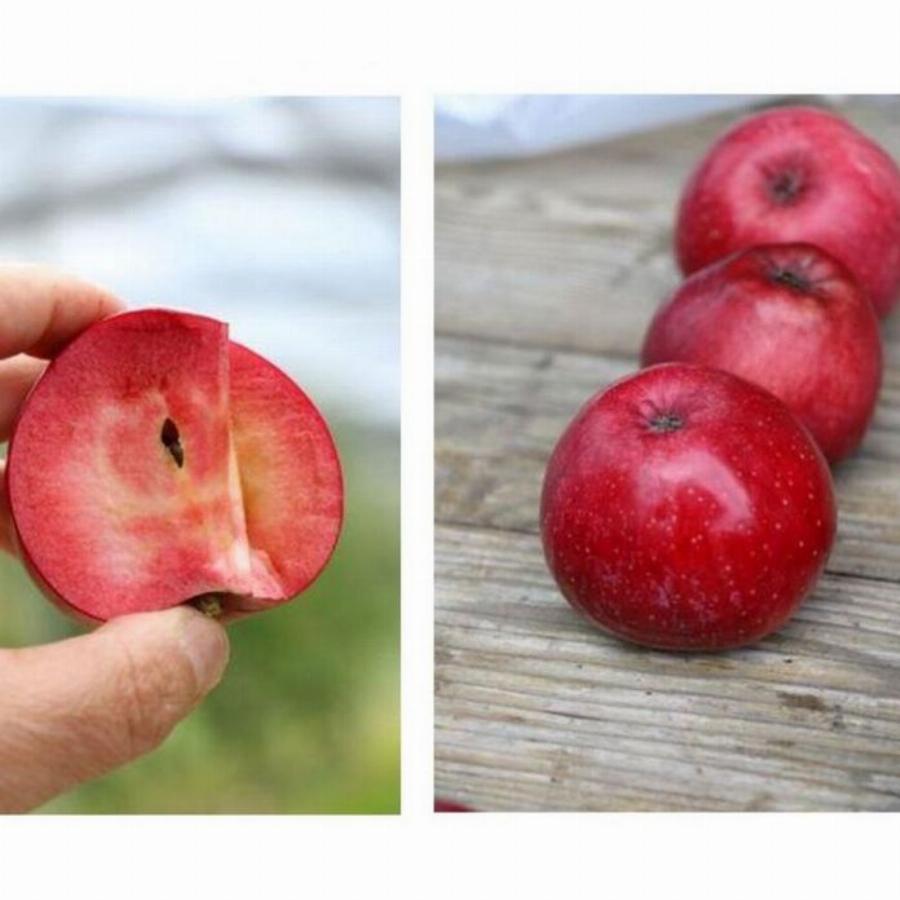 Срок созревания конец сентября. Дерево среднерослое, высотой 2,5-3 м. Плоды массой до 160 г, плоско-округлые, почти вся мякоть полностью окрашена в красный цвет (есть незначительные желтые вкрапления). Кожица красная, блестящая. Вкус кисло-сладкий. Сорт устойчив к морозам и распространенным болезням. Дерево с красными цветами смотрится очень нарядно. Яблони с красной мякотью цветут в более поздние сроки, чем яблони других видов. Благодаря этому они избегают весенних заморозков и цветут дольше обычных, имеют высокий процент завязи.
