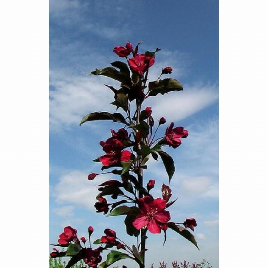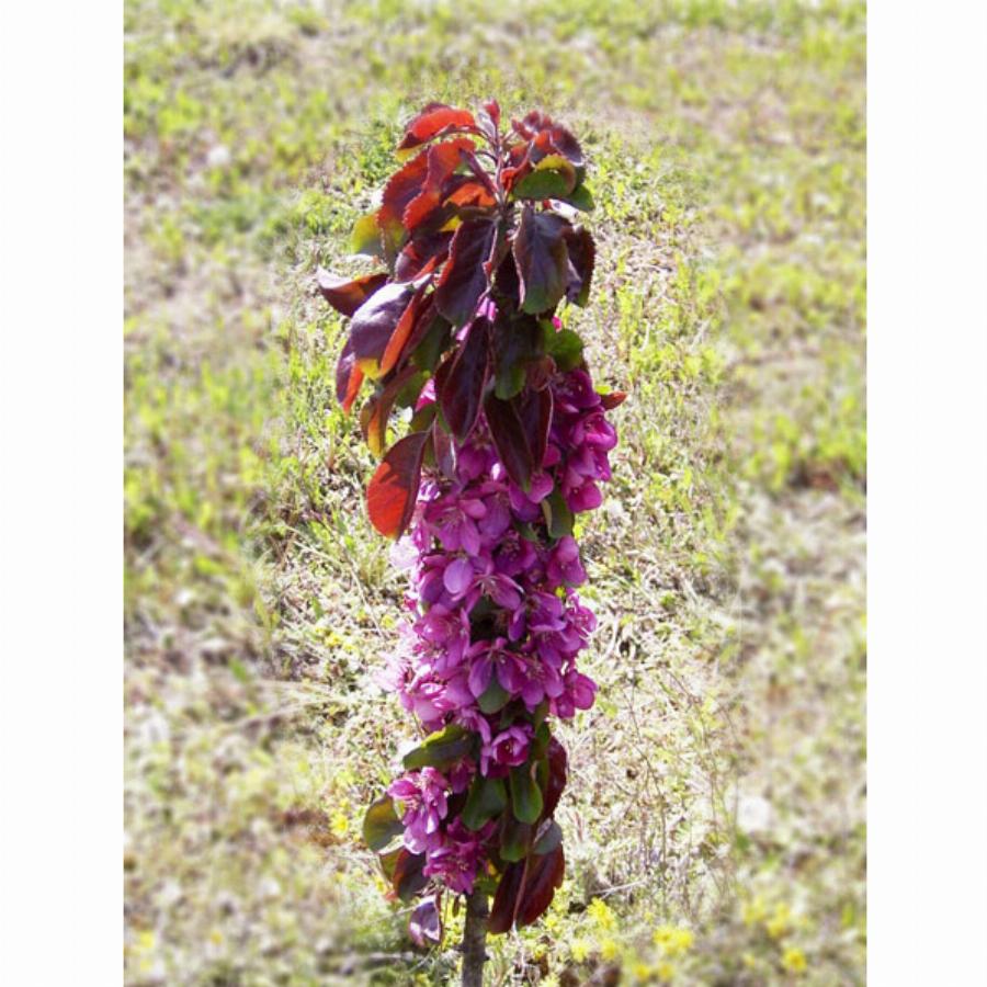 Колонна средней силы роста декоративного назначения. В 5-ти летнем возрасте высота 1,3-1,4 м. Цветы красно-лиловые, среднего размера. Ветвистости нет. Оголений нет. Обильно плодоносит. Плоды красно-малиновые с небольшим восковым налётом. Средняя масса плода 25-30 гр. Вкус сладко-кислый, вяжущий. Листовая пластина тёмно-зелёная с красновото бурым оттенком.