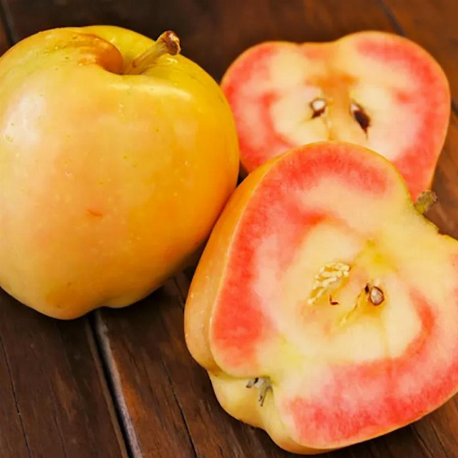 Яблоня с красной мякотью Пинк Перл — осенний чудо-сорт. Плоды которого имеют красно-розовую мякоть и потрясающий вкус с нотками малины и грейпфрута. Вкус терпкий и сладкий. Вес плодов около 200 г. Сорт самобесплодный и требует наличия компаньона со схожими сроками цветения.