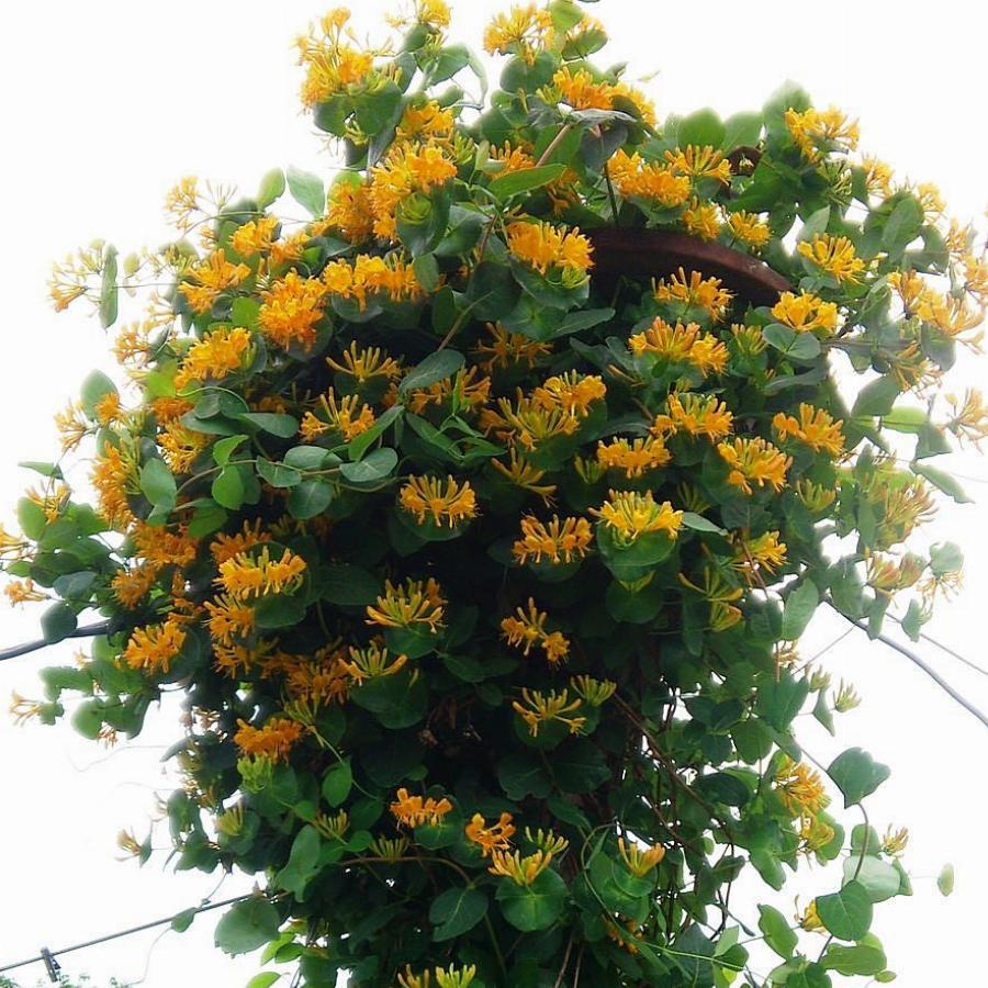 Высокая лиана. Цветки до б см, двугубые, оранжево-золотистые, собраны в конечное соцветие — головку, состоящую из двух мутовок. Цветет очень обильно в течении 12 дней. Плоды желто-оранжевые. К плодородию и влажности почвы довольно требовательна. Светолюбива, но обильно цвестет и в полутени. В суровые зимы может повреждаться, следует снимать с опор и укрывать.
