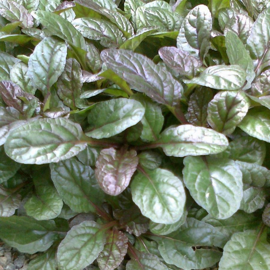 Многолетнее почвопрокрное растение с разноокрашенными листьями от светло-зеленых до ярко-розовых и синими цветками.